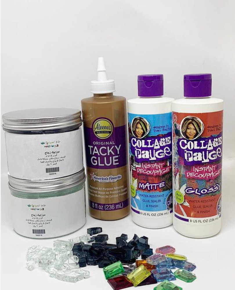 Product Description: Includes: 5 boxes of glass mosaic colors 1 decoupage glue (glossy or matt) Taki glue large size