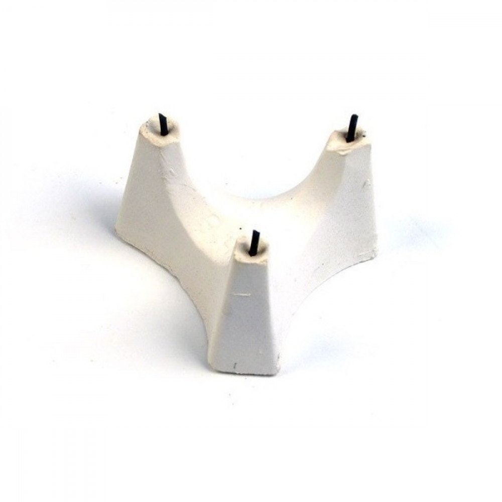 If you're interested in completely covering ceramic pieces with glaze even on the bottom surface but want to make sure your work doesn't spoil your oven racks, you might want to try the conical base (cone 10). The sturdy base is specifically designed to allow you to burn your ceramic pieces in your oven with the glaze on the underside. The base has three points of high-quality alloy steel that are evenly spaced and embedded in a stone base. It leaves no trace on the burnt glazes and can be easily removed after burning. The glazed pan is simply placed over the metal dots on the top side of the base in the oven. The base raises the pan so that it is not in contact with the oven rack, and the metal dots on the base will not stick to the glazed pan, even though they are in contact with the glass. Now you can finally enjoy full cut glazing! Our F Series base is designed to fit lids, deep tools, or anything glass with a dent. This long lasting base is designed to withstand frequent burns and harsh handling. It is strong and durable, because it is made of a high-temperature clay body that can burn up to 2400 degrees Fahrenheit (cone 10), and it is made of the highest quality materials. The points are made of the finest metal alloys, making them durable and long lasting. The height of the base #9H of the F series is 2 inches and the point-to-point spacing is 2 inches.